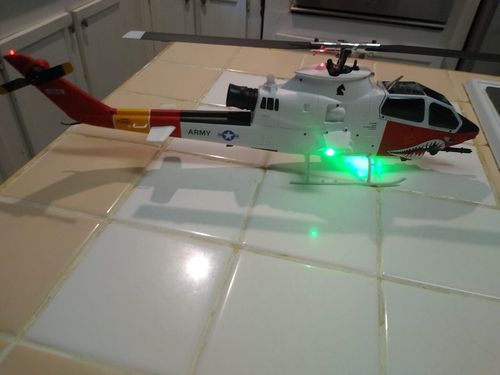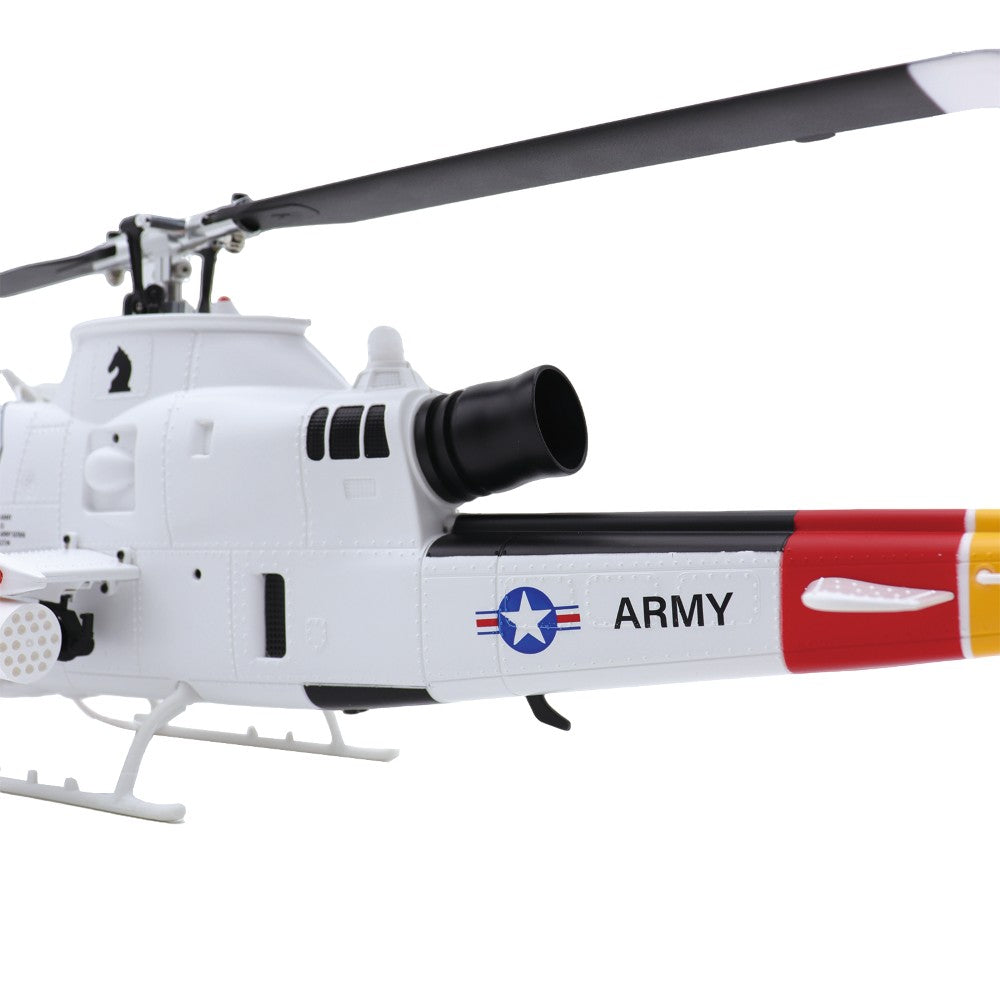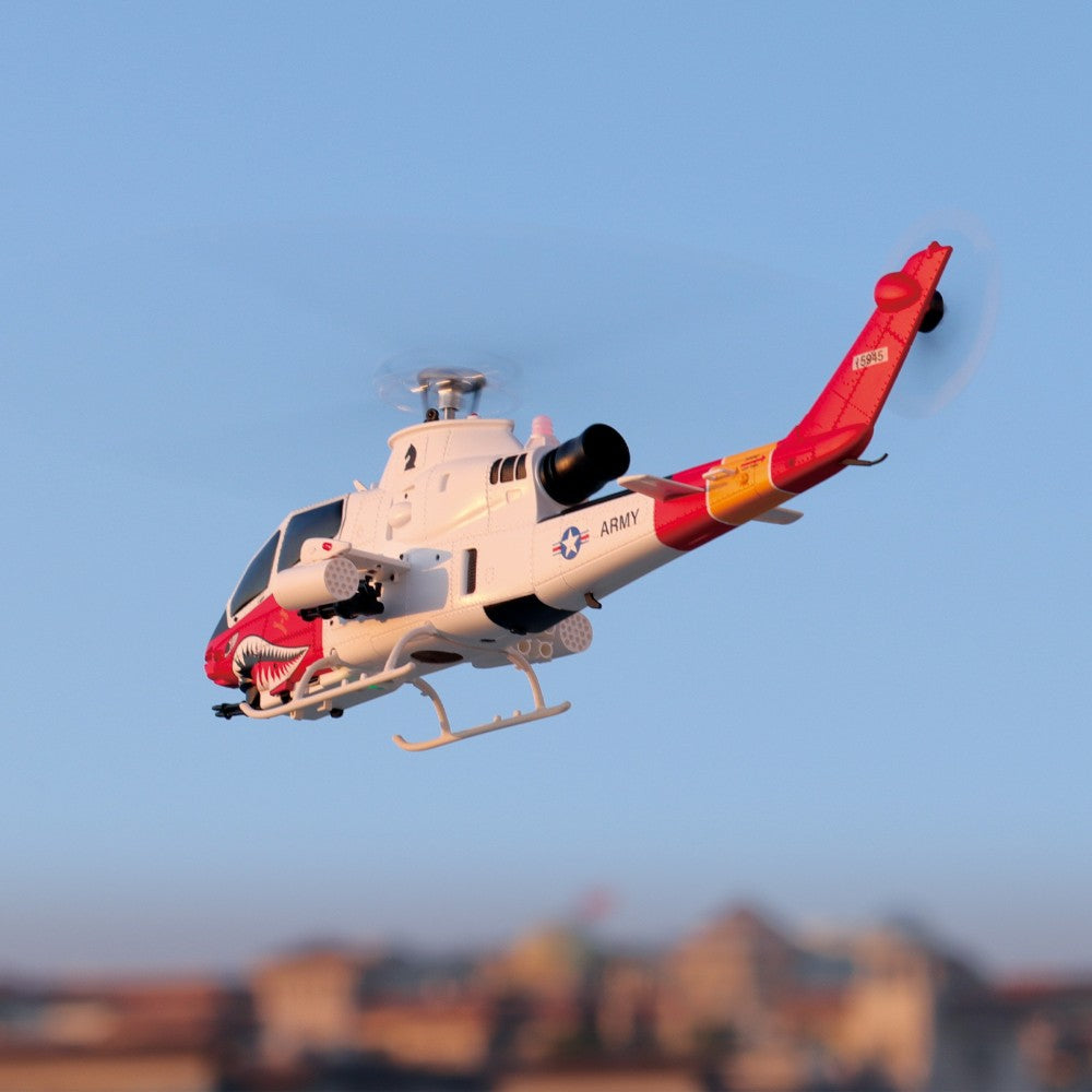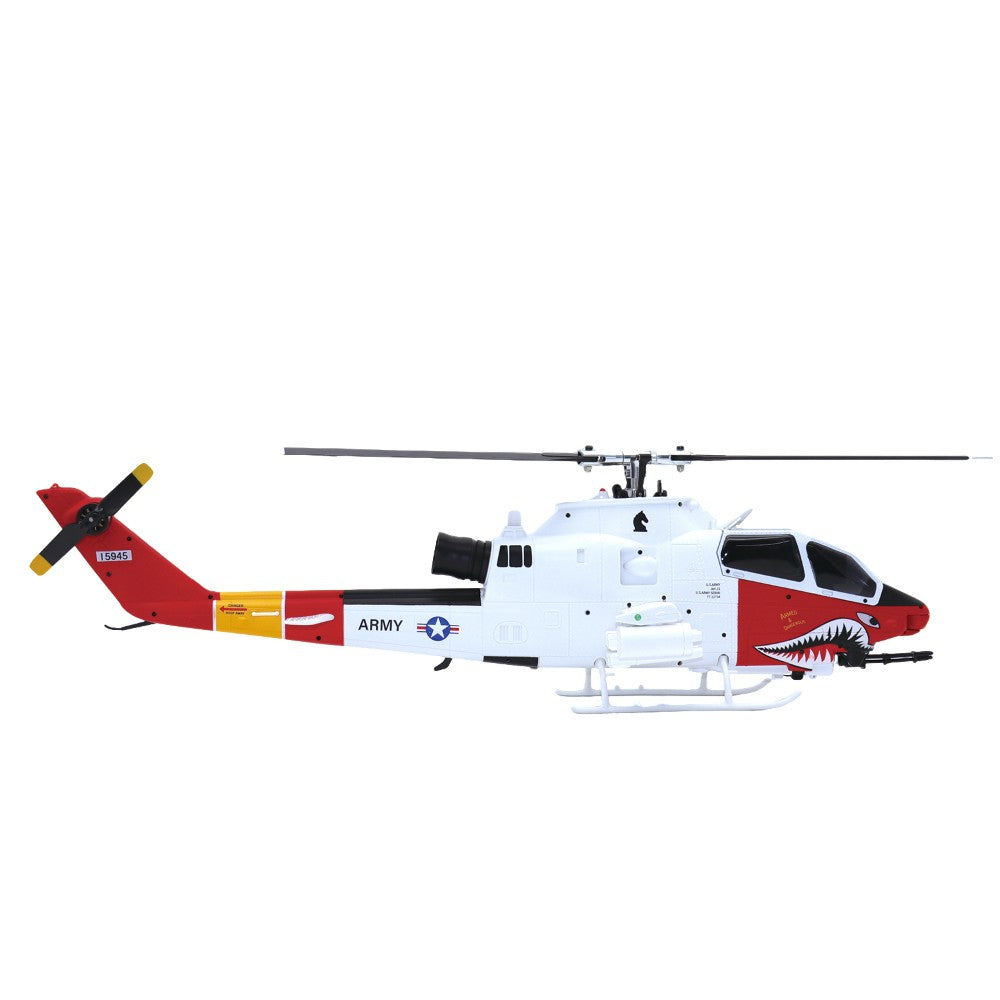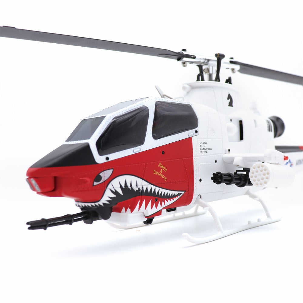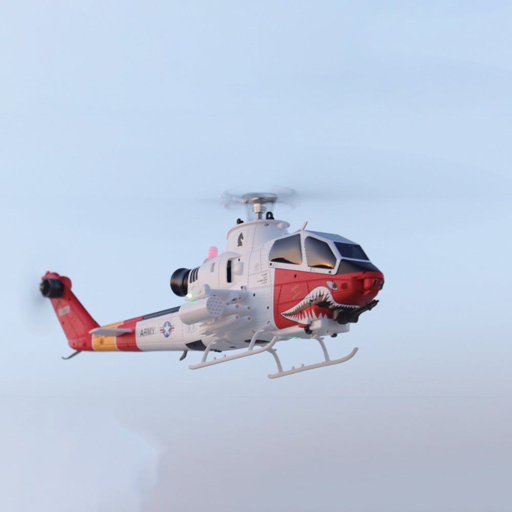 A scale of the AH-1 Cobra. Featuring dual brushless motors, GPS, optical flow positioning, wind-resistant metal-gear servos, smart flight modes, 8CH transmitter with telemetry, durable carbon fiber/nylon construction, and 10-12min flight time.