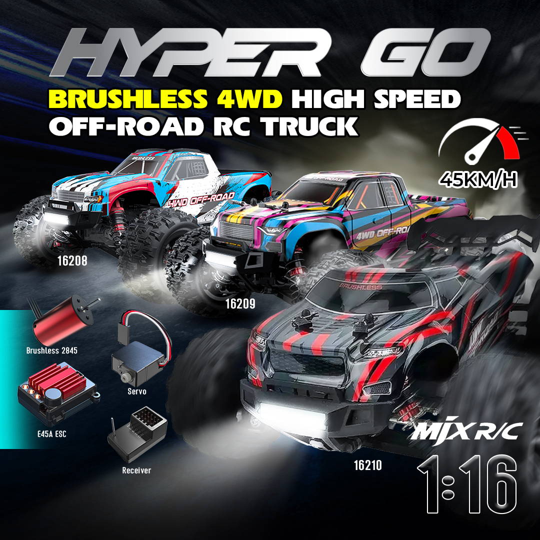 Introducing the MJX Hyper Go 16208, 16209, 16210 - a series of brushless 4WD off-road RC trucks that are designed to provide high-speed thrills and supreme control on any terrain.