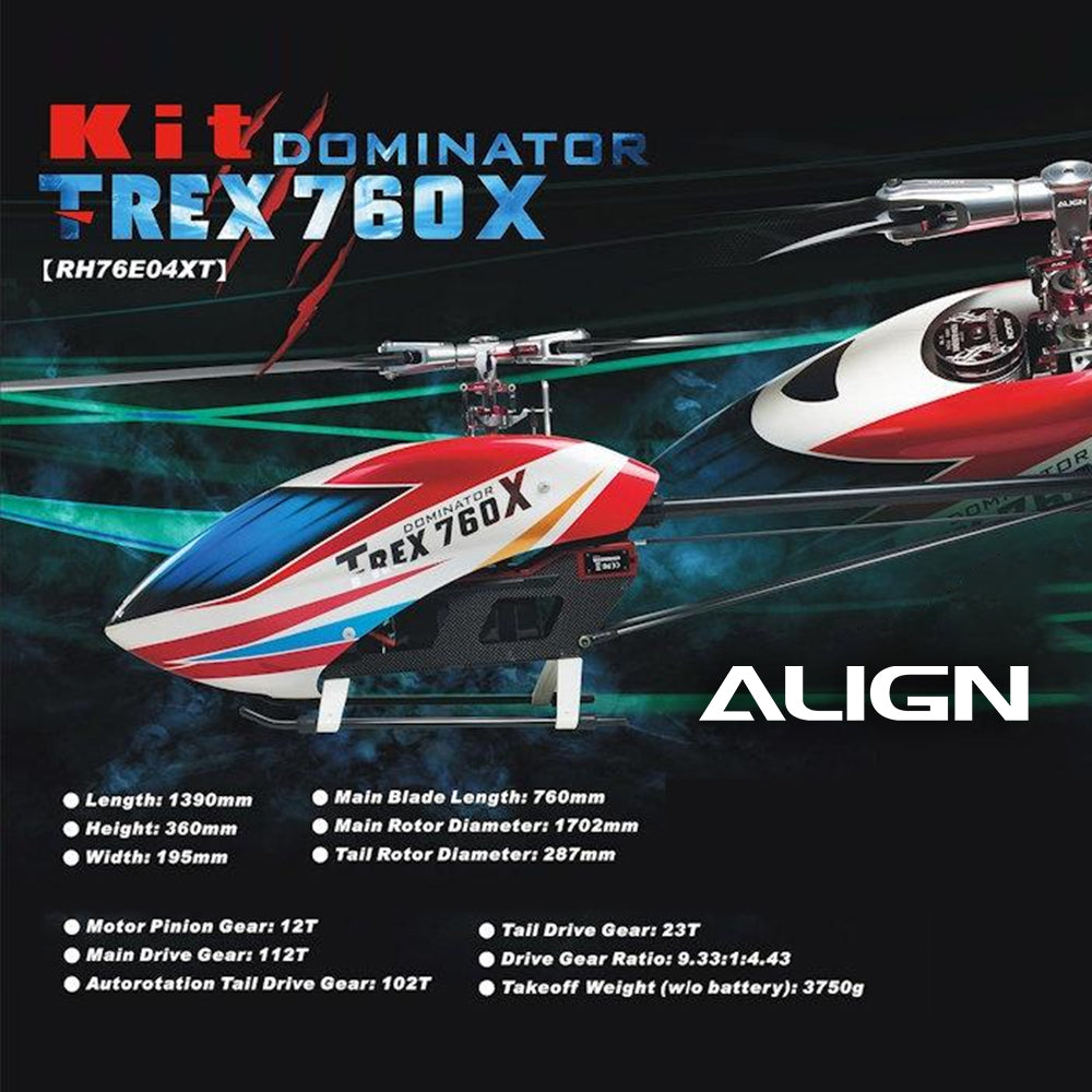 The brand new Align T-REX 760X features with new body length and new 760 main blade for F3C/3D flight design providing the outstanding performance than other series will give you the different flying feeling.