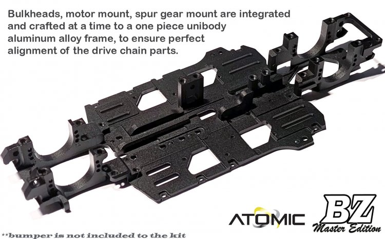 - New main frame which integrated the front and rear bulkhead, spur gear mount, motor mount and the chassis plate. All these parts are crafted in a single 7075 alloy to make sure the perfect alignment of the drive chain parts.