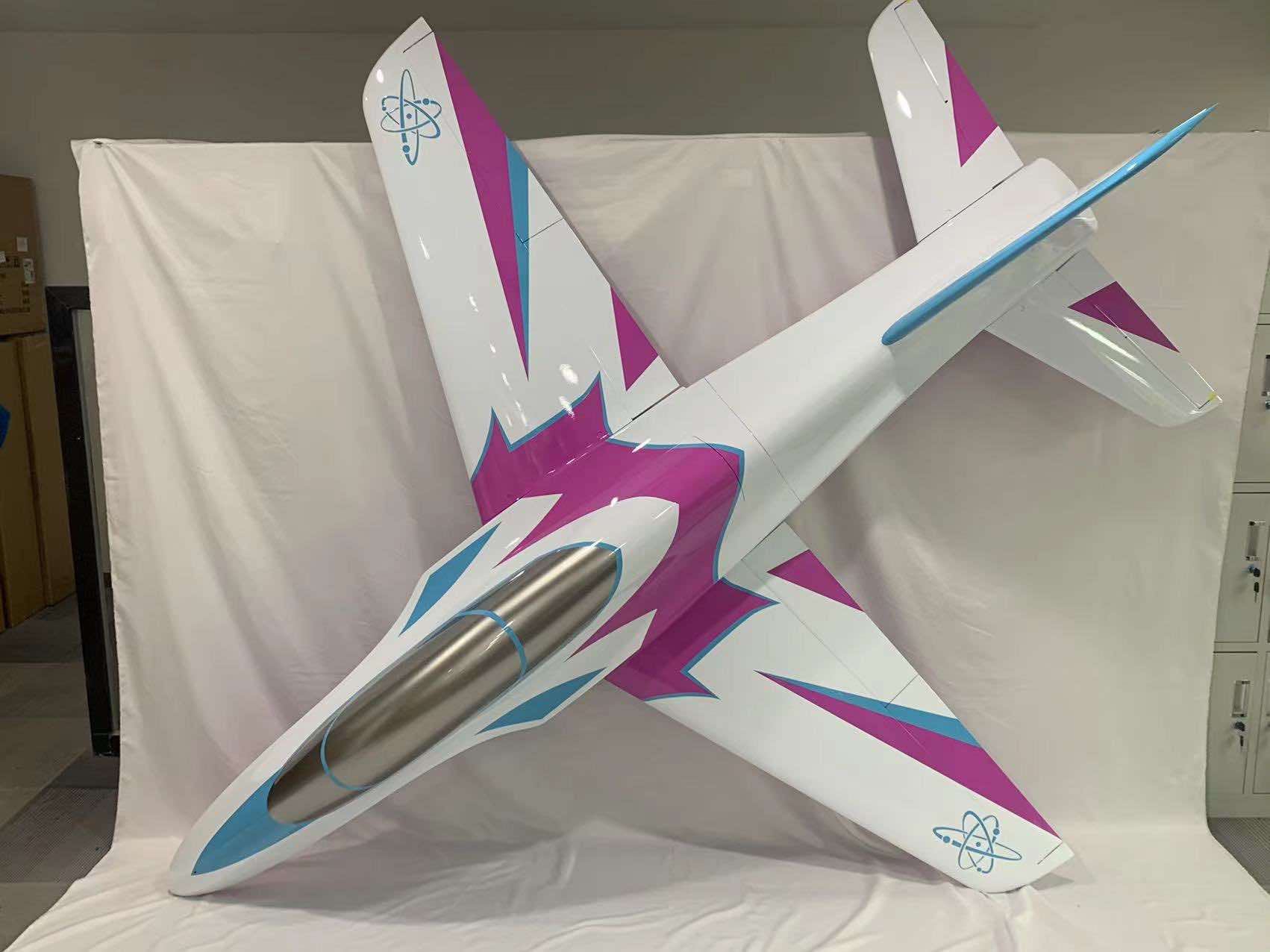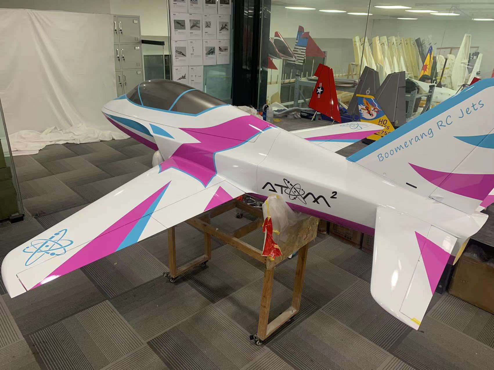 The Atom Squared is a fully composite 3D sport jet with amazing features! Quick release wings, stabs and vertical fin, thumb screws to split the fuselage right behind the turbine, hidden linkages on the ailerons and flaps and a massive hatch providing easy access to everything in the fuselage.