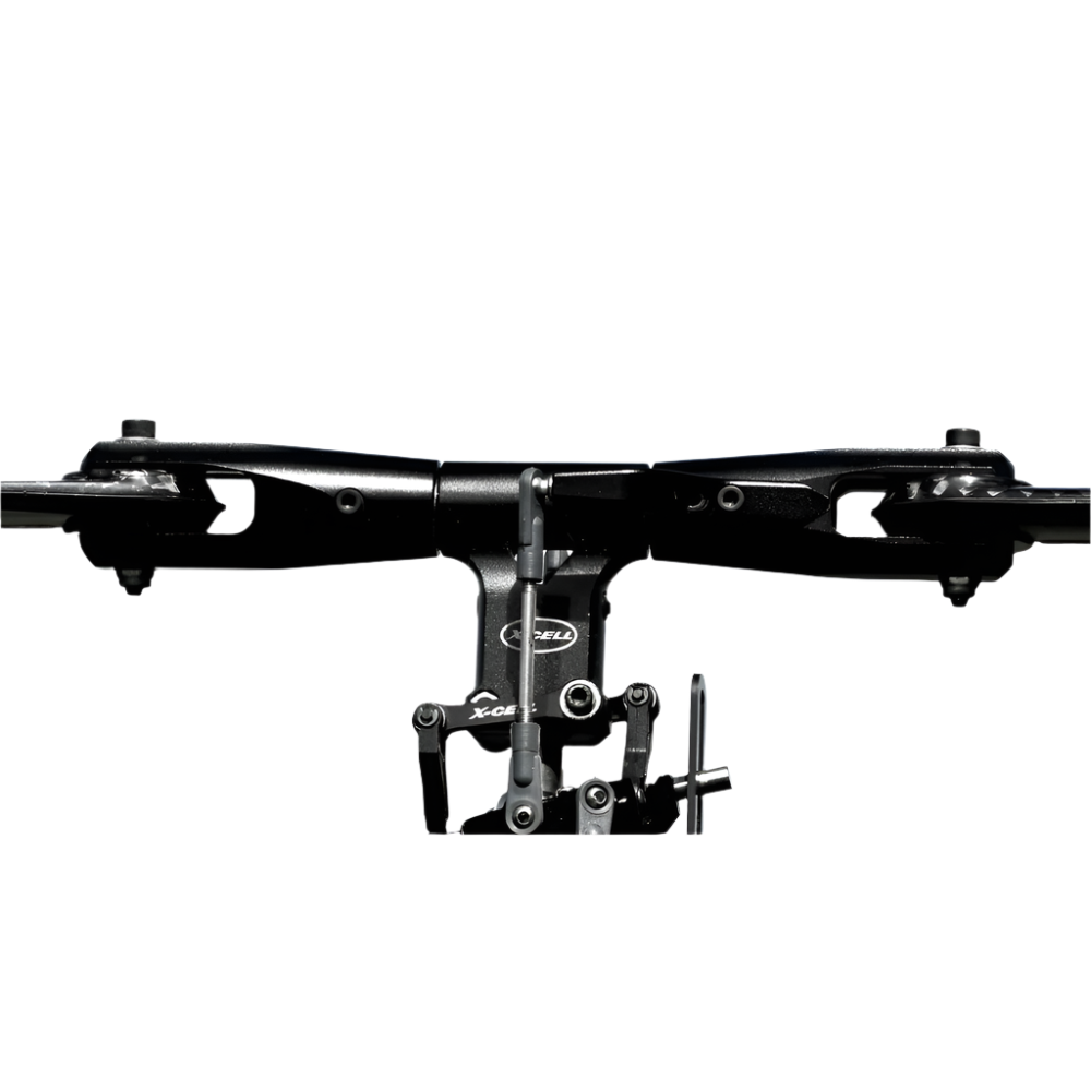 The damping values of the head can be adjusted over a wide range. The rotor head comes standard with three O-rings per side in 90-80-90 Shore tuning. Optional setups are available such as two O-rings and one POM bushing per side or one O-ring and two POM bushings per side. O-rings are available in hardness grades from 50° to 90° Shore. This allows the head to be fully adjusted to the pilot's flying style and expectations.