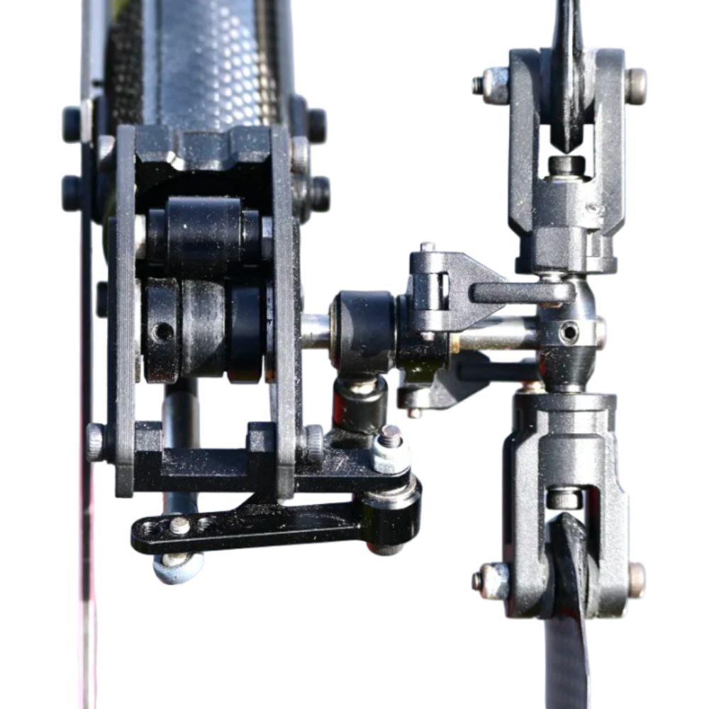 As already known from the Whiplash family, Miniature Aircraft now completely eliminates the use of spacer bushings which are typically used with a bell crank to ensure the distance between two ball bearings. Instead of a spacer bushing, a third radial bearing is used which ensures the distance between the two outer bearings. The outer bearings are now designed as flange bearings. This significantly increases the robustness and service life of the bearing position.