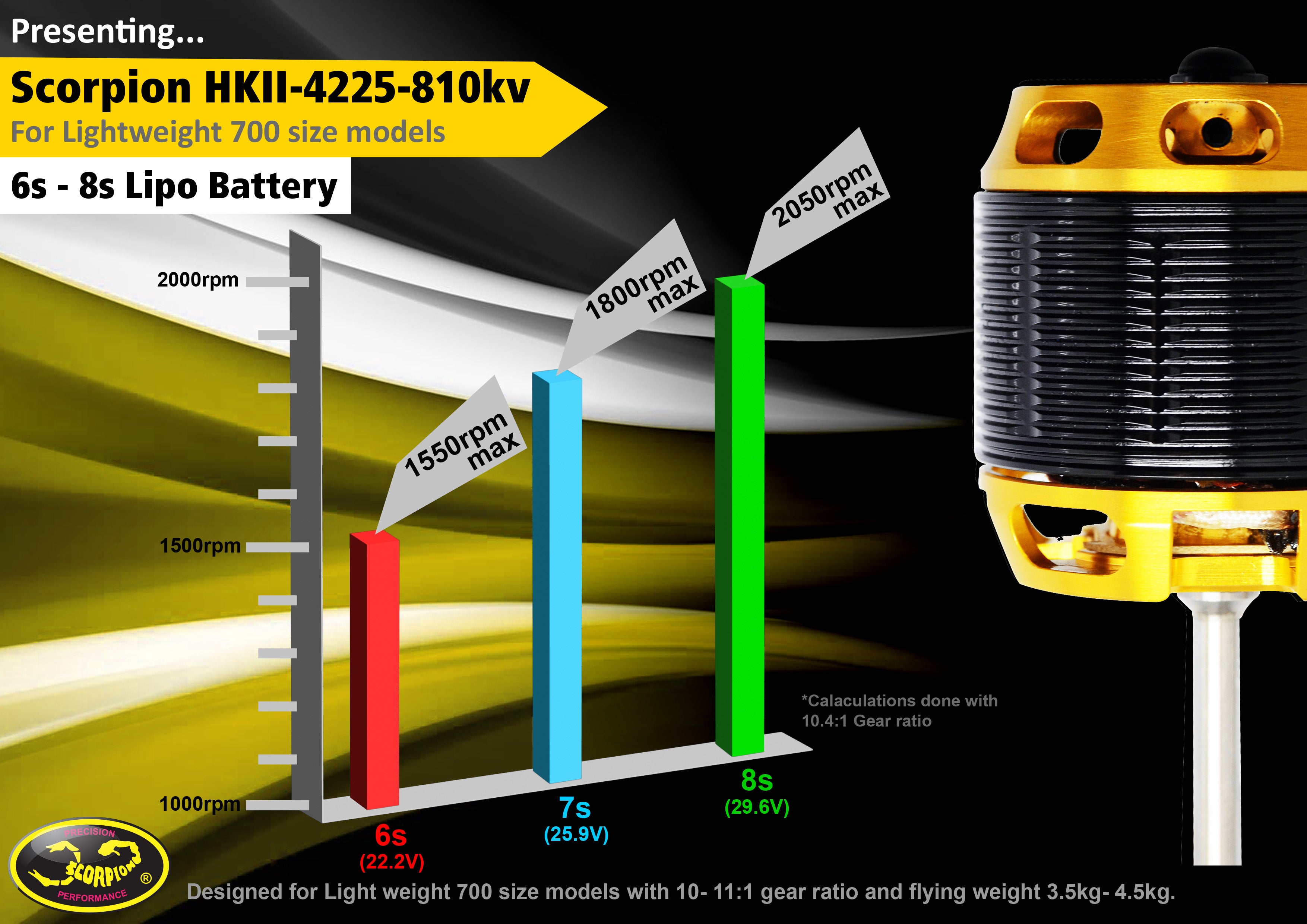 With the trend of ultra light weight 700 size models running 6-8s batteries on the rise, the market called for a light weight, powerful, but not battery puffing motor. So Scorpion created the HKII-4225-810kv motor for a Limited Edition run! Sized directly between our proven HKIV-4025 and HKII-4525 motors in terms of weight and power, and LIGHTER yet MORE powerful then our competitors 4030 motors, this motor represents the most technologically advanced power source ever offered for an electric helicopter.